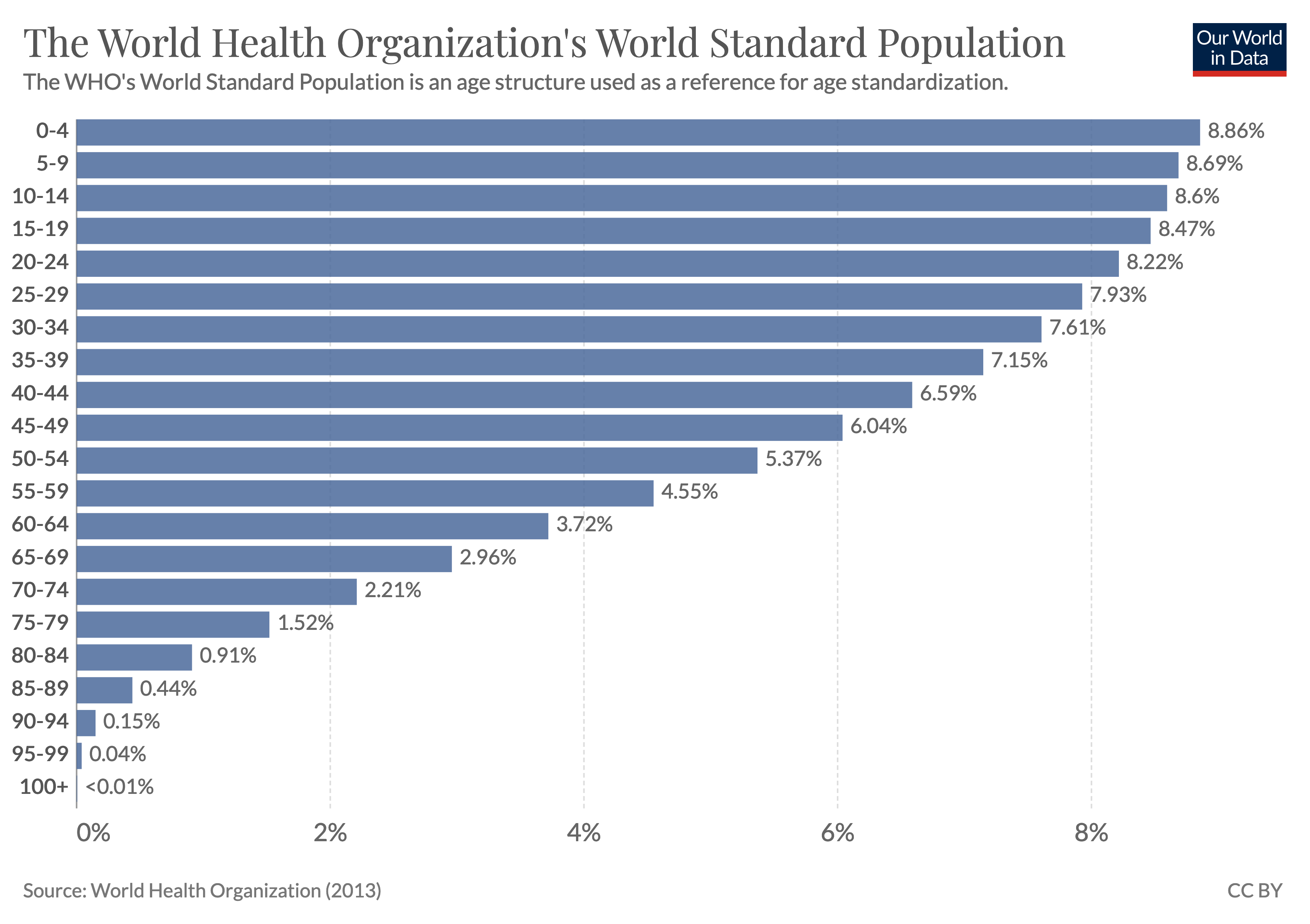 For example, in the WHO’s World Standard Population, the under-5 age group represents 8.86% of the standard population, the 5 to 9 years age group represents 8.69% of the standard population, etc.