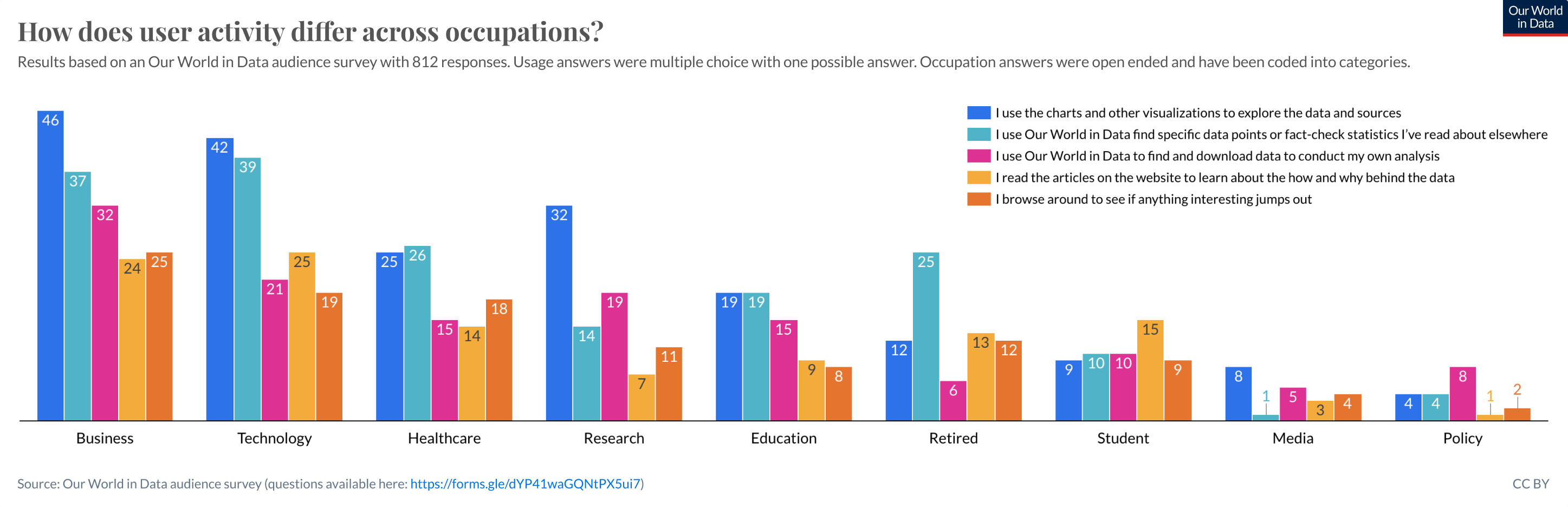 - What's the relation between our users' occupations and how they use Our World in Data? Are there any key combinations we should focus on?