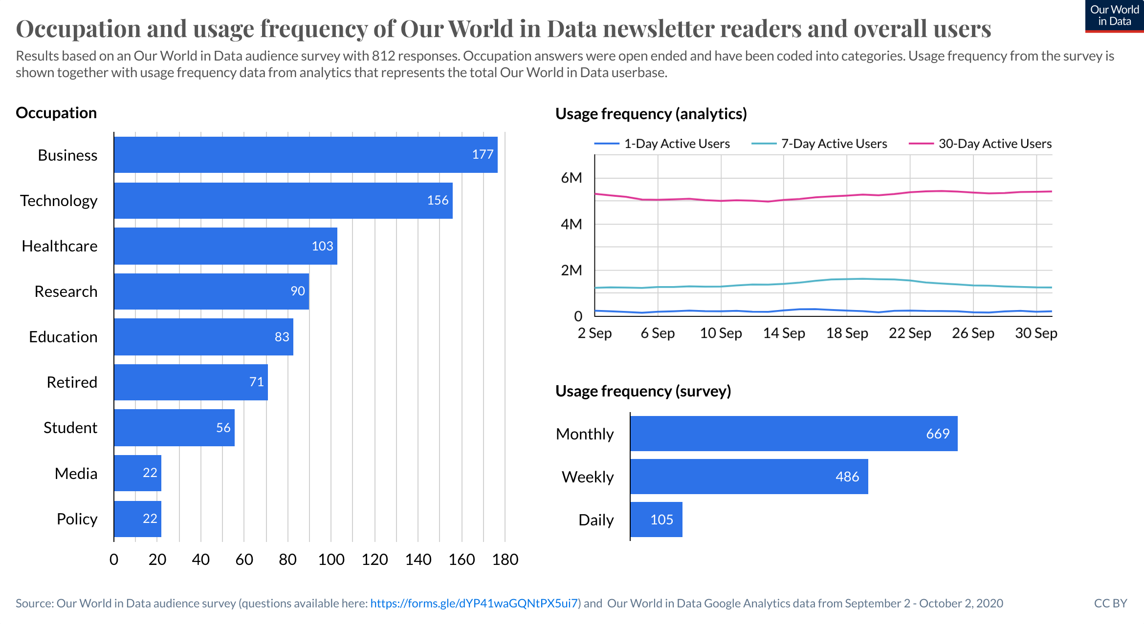 Our analytics data tells us which pages are popular (these days COVID-19 is at the top), where our users are coming from (mostly Google), and on which device type people are more likely to interact with our visualizations (desktop). While that is highly useful data, it doesn't give a clear idea of who our users are, and how they use Our World in Data.