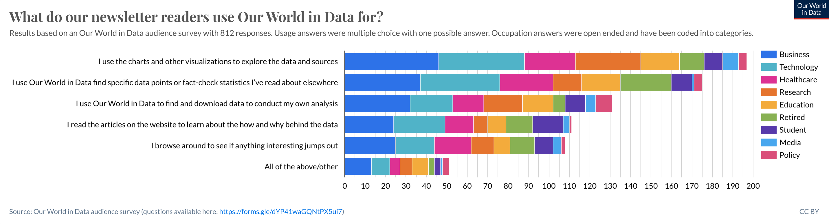 The survey provides us with a glimpse of how our (newsletter) audience uses Our World in Data, but to get to a more in-depth understanding, we'll need to talk to our users in more detail (which I'm doing almost daily right now).