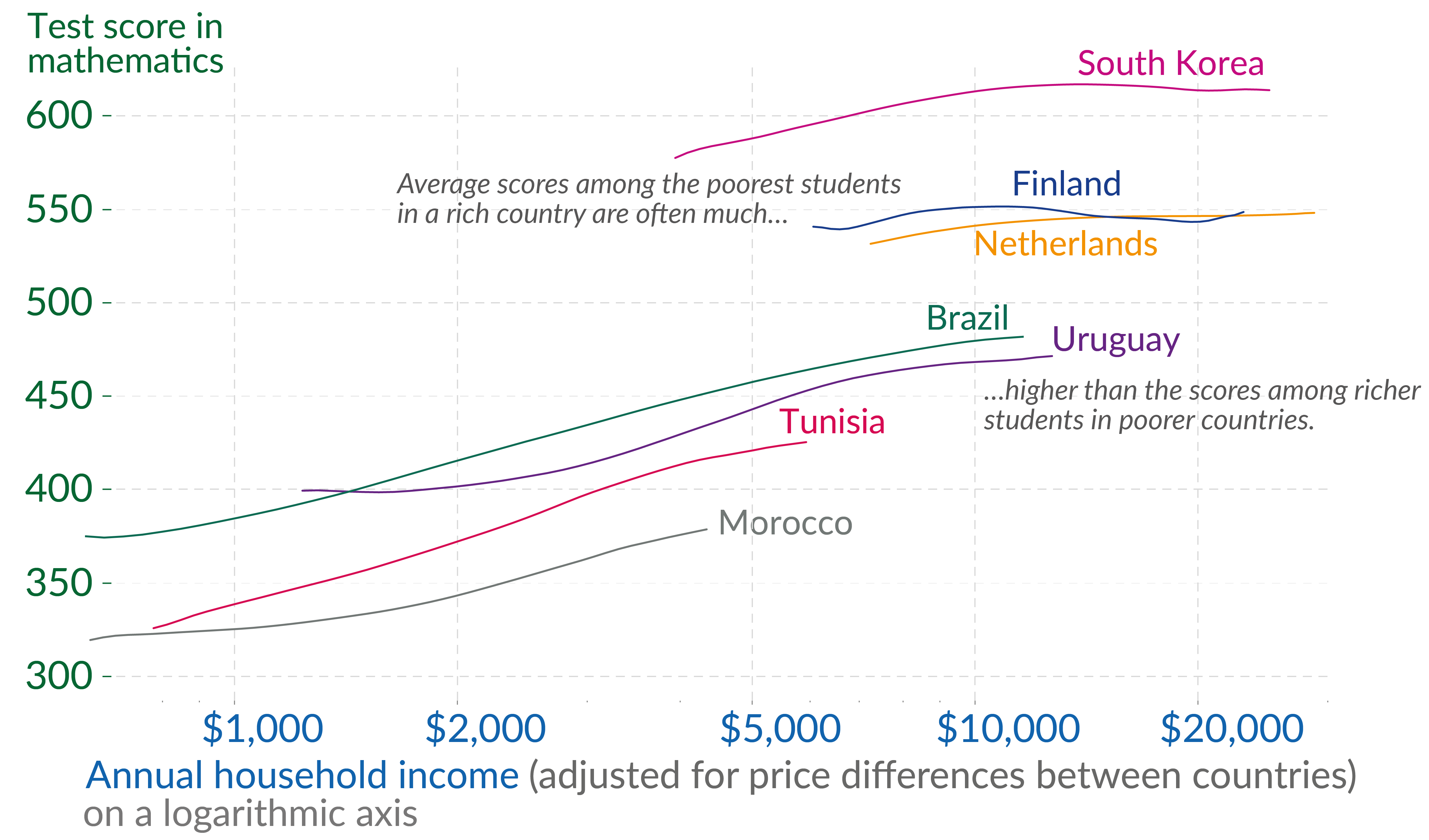 For example, look at the test results of the poorest students in Korea or Finland. The poorest Korean or Finnish students are poorer than the rich students in Brazil, but their math scores are much higher.