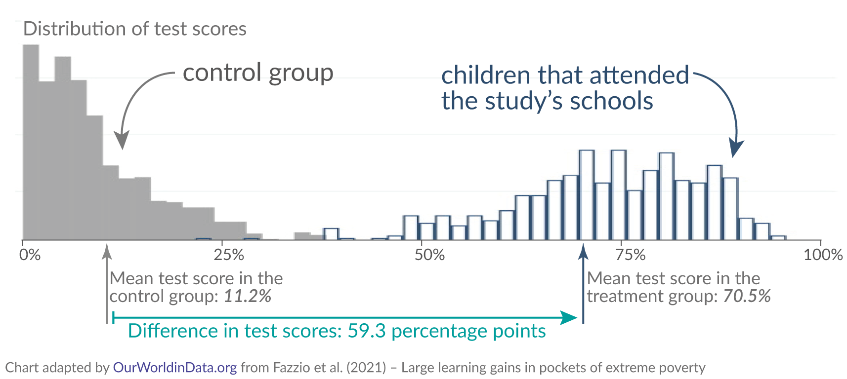 The study’s schools trained teachers, provided scripted lessons, monitored children and teachers regularly, involved the village communities, and provided adequate resources to support all operations. To see whether these well-resourced schools made a difference, they set up a randomized controlled trial: they compared how much the children learned in the study’s schools with children in the control group (schools that carried on with their teaching as they did before).