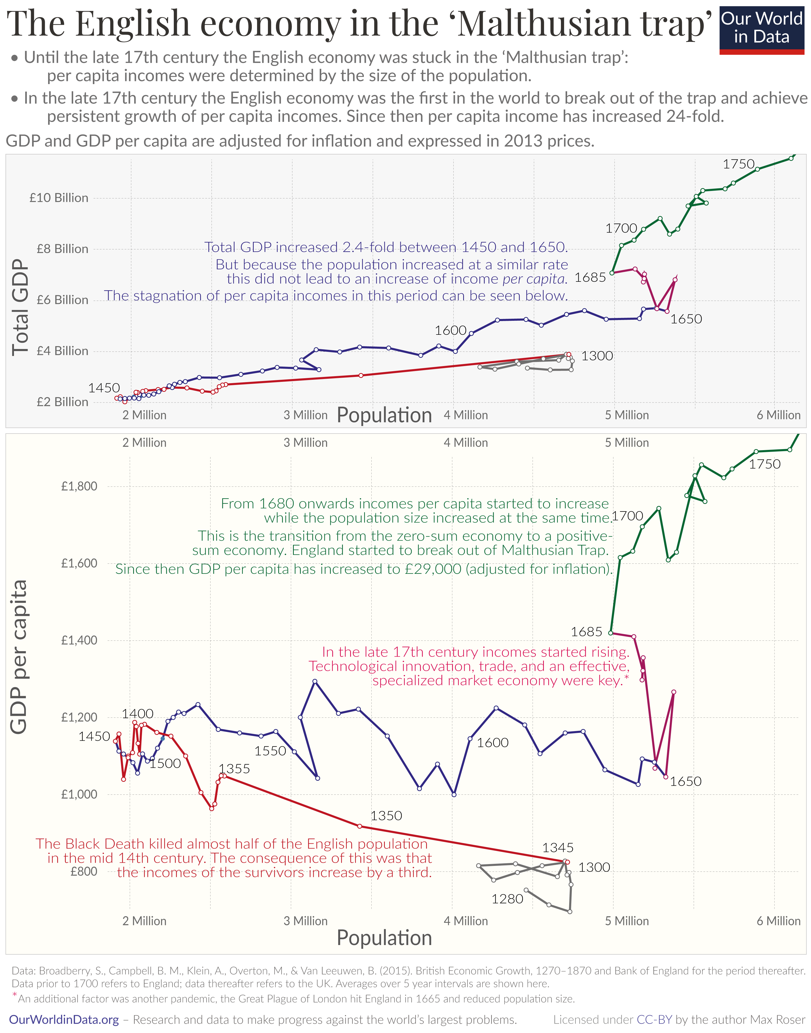 Max Roser (2020) - “Breaking out of the Malthusian trap: How pandemics allow us to understand why our ancestors were stuck in poverty” Published online at OurWorldInData.org. Retrieved from: 'http://staging-site-fix-deleted-assets-in-cache/breaking-the-malthusian-trap' [Online Resource]BibTeX citation
