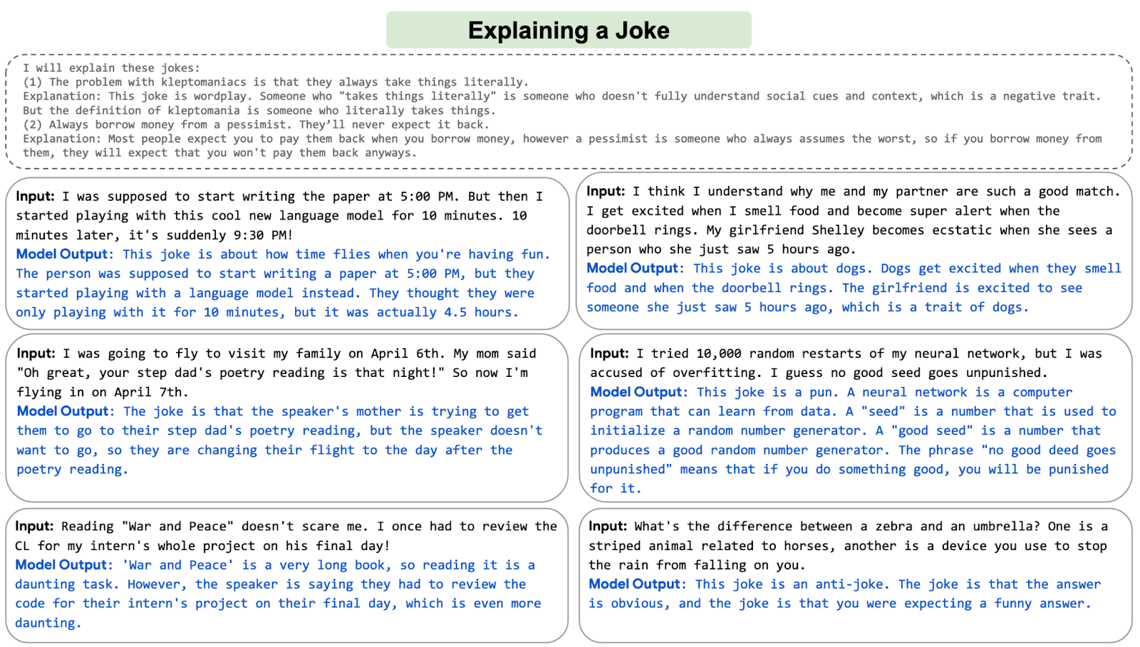 The image shows examples of an AI system developed by Google called PaLM. In these six examples, the system was asked to explain six different jokes. I find the explanation in the bottom right particularly remarkable: the AI explains an anti-joke specifically meant to confuse the listener.