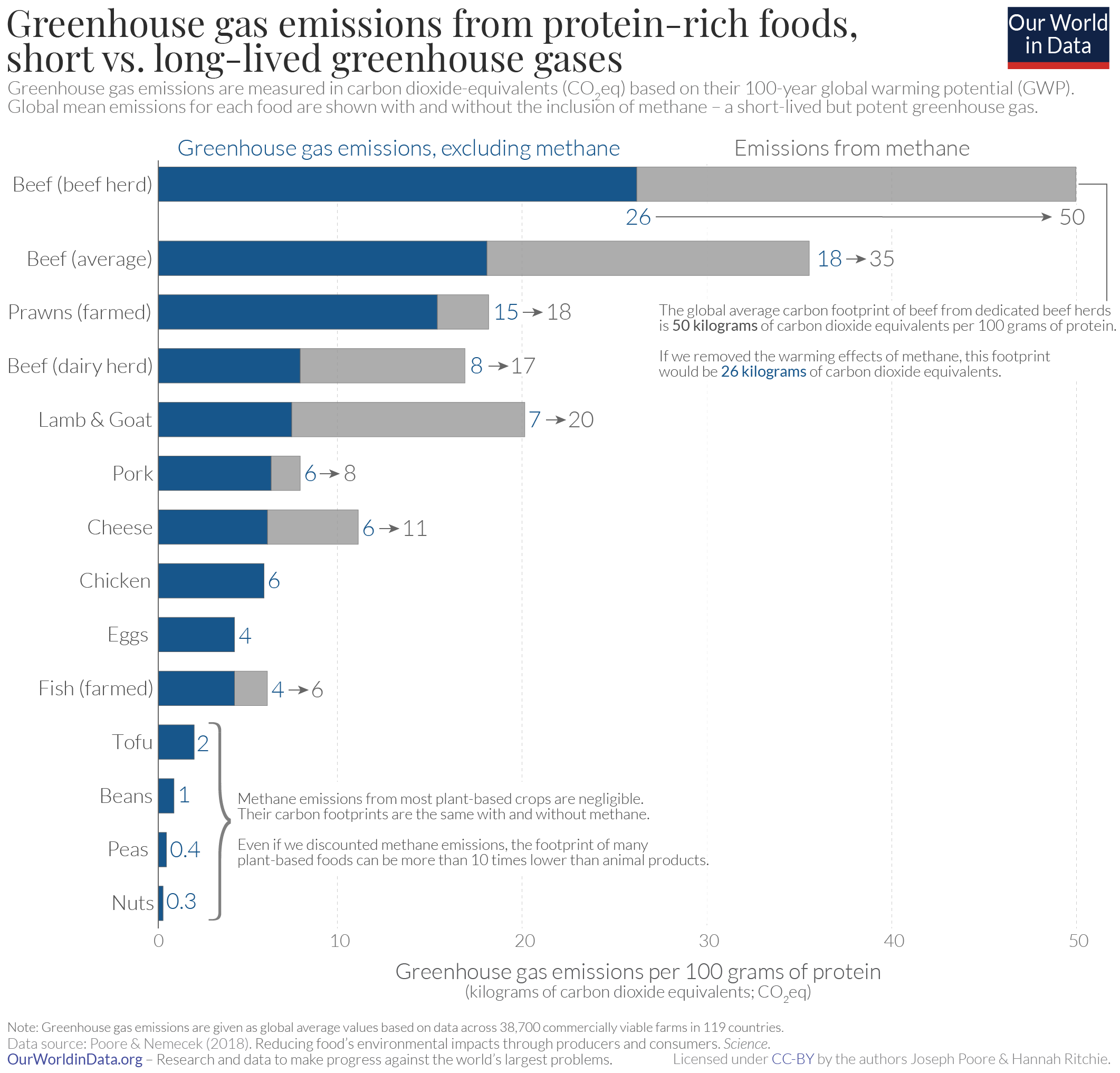 In the other visualization I therefore show these comparisons as the carbon footprint per 100 grams of protein. Again, emissions from methane are shown in grey; but this time, emissions excluding methane are shown in blue.