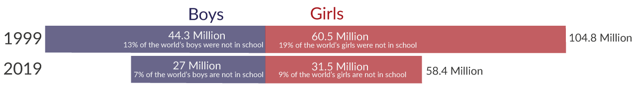 A generation ago, it was girls in particular who did not have access to schools. This inequality has declined, and today, the absolute number and the share of boys and girls who are out of primary school is similar.6