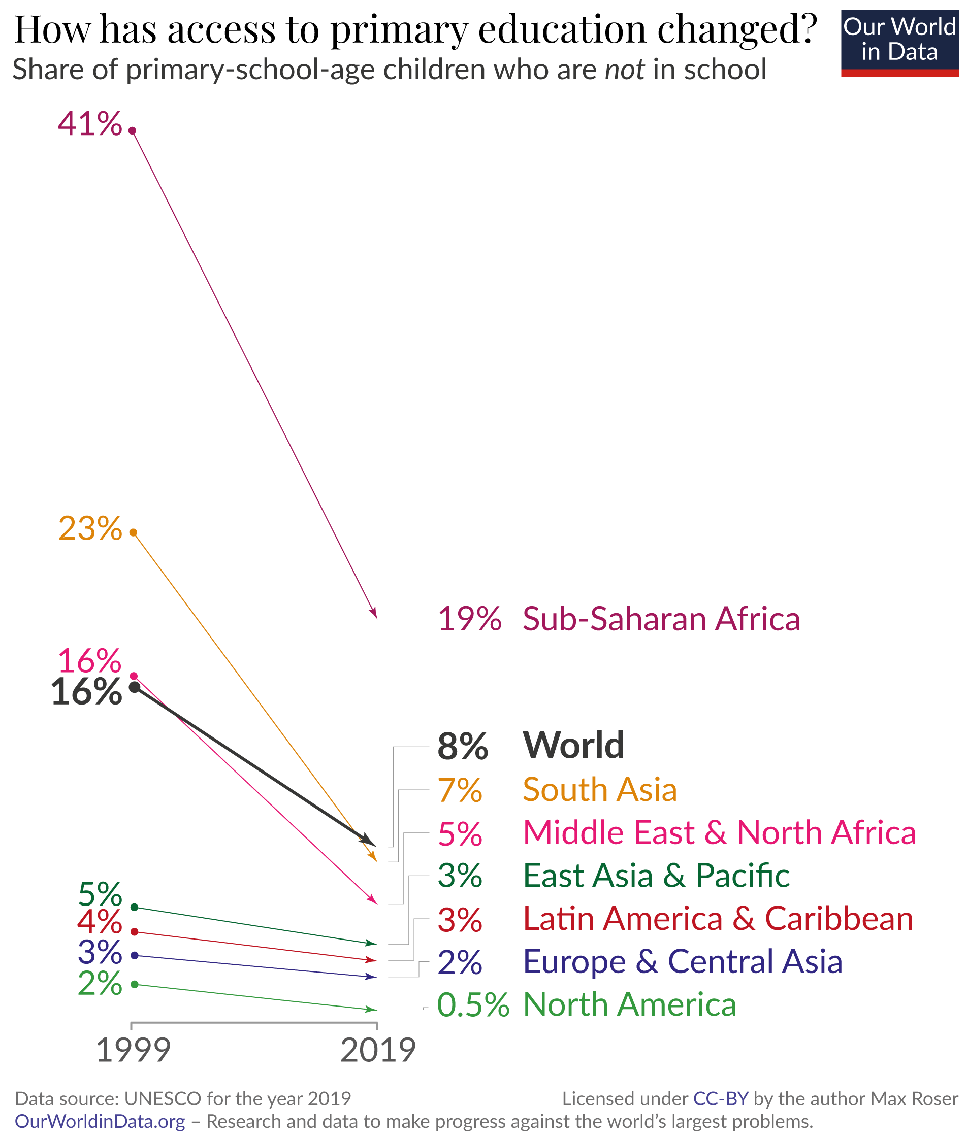 This chart shows the same data as the first one, but it now also shows how the world has changed since the previous generation, 20 years ago. The share of children who are out-of-school has declined in all world regions. Globally, this share has halved. Today, 8% of children are not in school; twenty years ago this was 16%.
