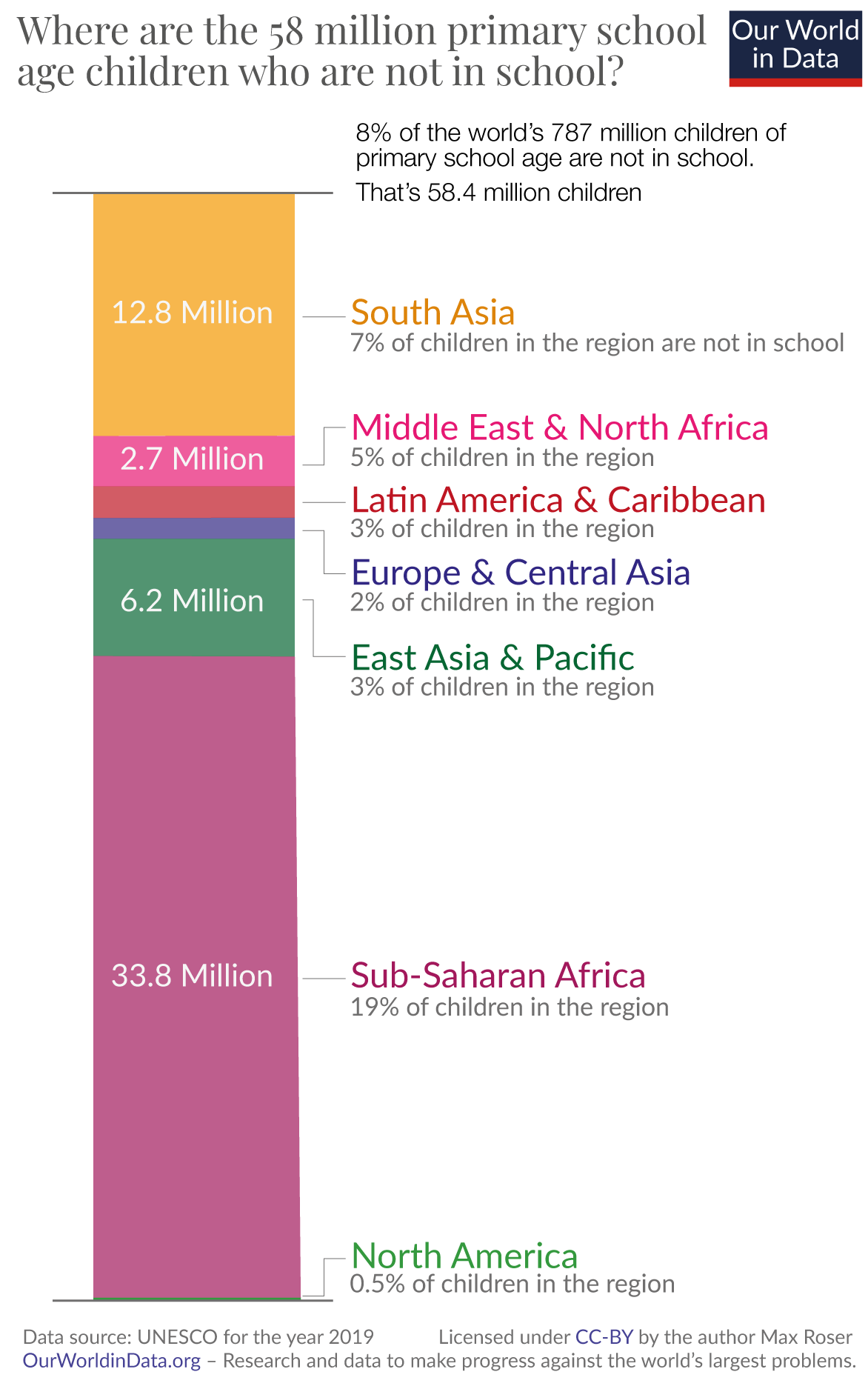 Max Roser (2021) - “Access to basic education: almost 60 million children of primary school age are not in school” Published online at OurWorldInData.org. Retrieved from: 'http://staging-site-fix-deleted-assets-in-cache/children-not-in-school' [Online Resource]BibTeX citation