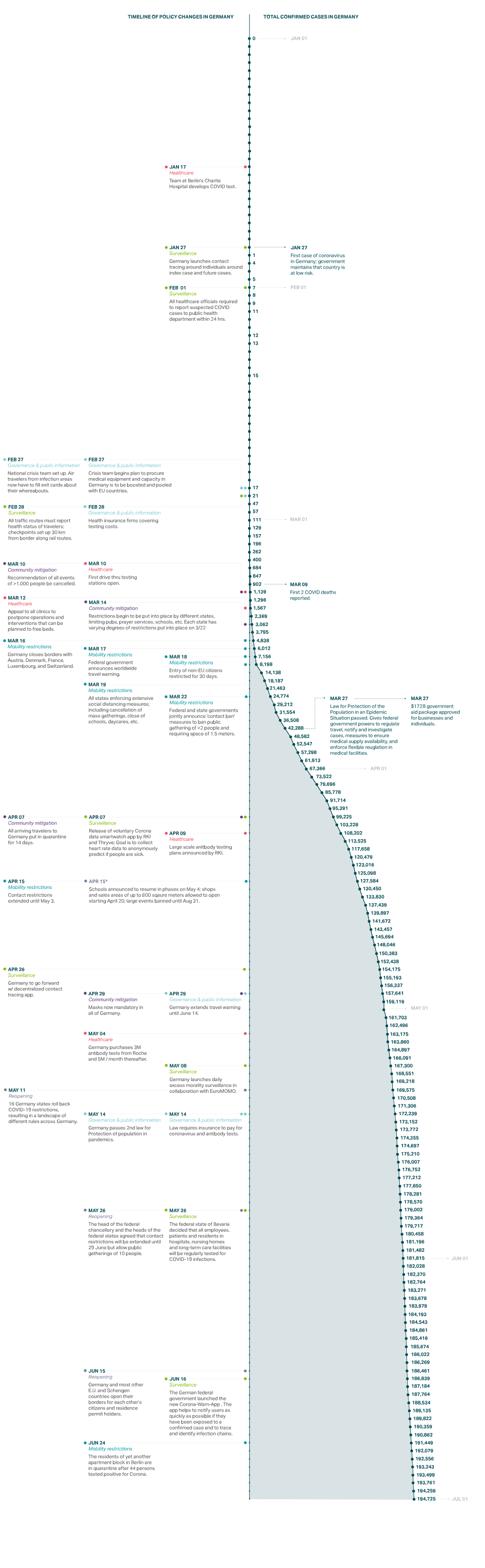The first case in Germany was reported on January 27in Bavaria. On February 1, the government further clarified reporting obligations and mandated that all health care providers report suspected cases of COVID-19 within 24 hours to local public health authorities.10 On February 27, with a total of 26 confirmed cases, the government set up an inter-ministerial national crisis management group. The next day, the government required all travelers entering the country from high-risk areas (such as, at that time, areas in China or Italy) to provide information about possible previous exposure and contact details.11 Testing is available at no cost to the patient upon medical or epidemiological indication and testing for epidemiological indications was also recently included in asymptomatic contacts or screenings. RKI began issuing daily situation reports for the national and international public health sector on January 23, although the first reports were confidential due to the granularity of the data.