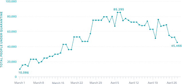 From January 23 to May 1, over 200,000 people spent time in a quarantine facility.30 Those in government run quarantine centers are provided with three meals a day, sleeping facilities, and basic toiletries; reactions to conditions in the quarantine centers on social media have been generally positive.32 Though not popular, “On-demand” quarantine facilities were also established in selected hotels for those who are willing to pay.