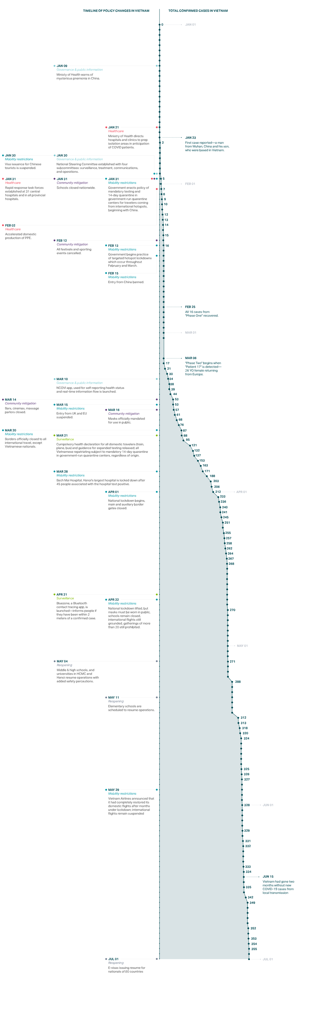 Even before the first cases in Vietnam were confirmed, Vietnam took the first of many steps to implement closures and limit mobility for citizens and international travelers. Most other countries waited to make these types of decisions until numbers were much higher.