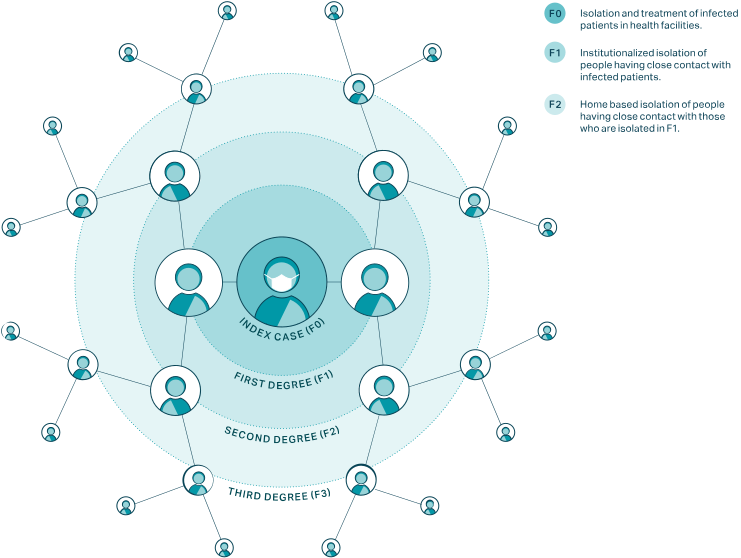 - Once a patient with COVID-19 is identified (F0), local public health officials, with support from health professionals, security officers, the military, and other civil servants, work with the patient to identify who they might have been in contact with and infected in the past 14 days.
