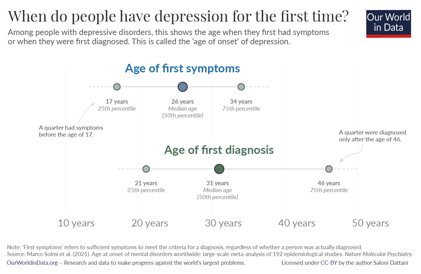 Saloni Dattani (2022) - “At what age do people experience depression for the first time?” Published online at OurWorldInData.org. Retrieved from: 'http://staging-site-fix-deleted-assets-in-cache/depression-age-of-onset' [Online Resource]BibTeX citation