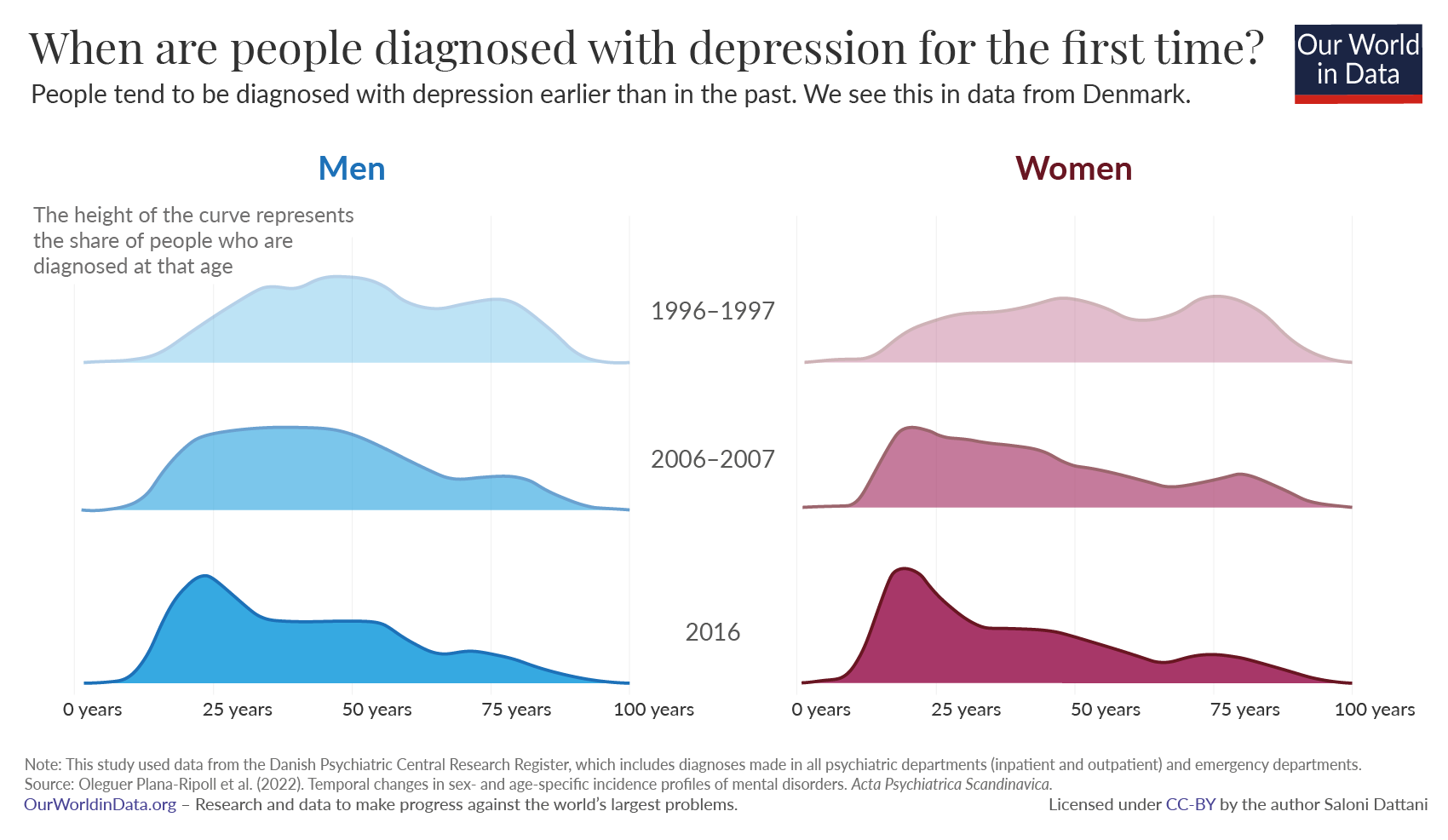 In 1996 the age of diagnosis varied widely. Young, middle-aged and old people all had a similar chance of being diagnosed with depression for the first time. By 2016, people were diagnosed much earlier. They were much more likely to be diagnosed with depression when they were young adults than later in their lives.