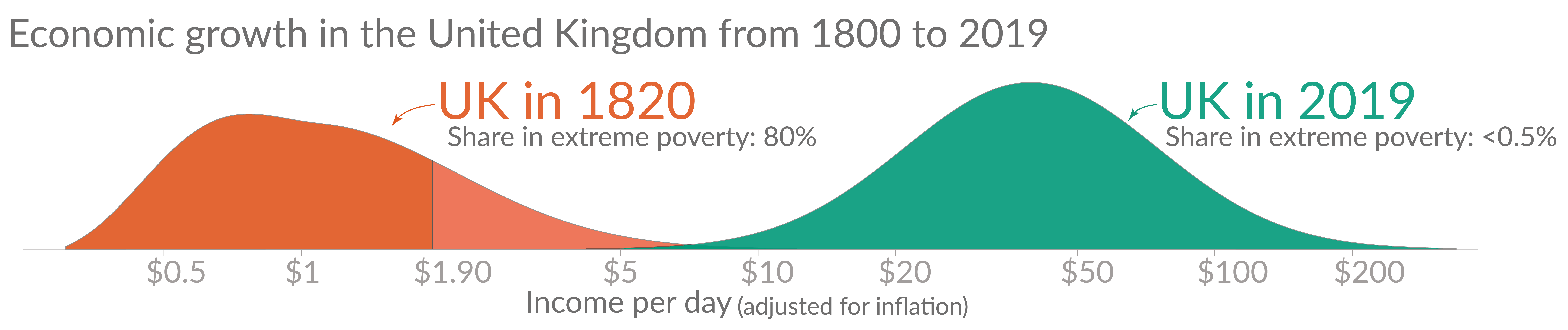A country that achieved large growth is the UK: the orange distribution on the left shows incomes in the UK two centuries ago; the majority lived in extreme poverty. The green distribution shows how the distribution of incomes has changed since then. Two centuries of economic growth lifted the majority of people out of the deep poverty of the past.13