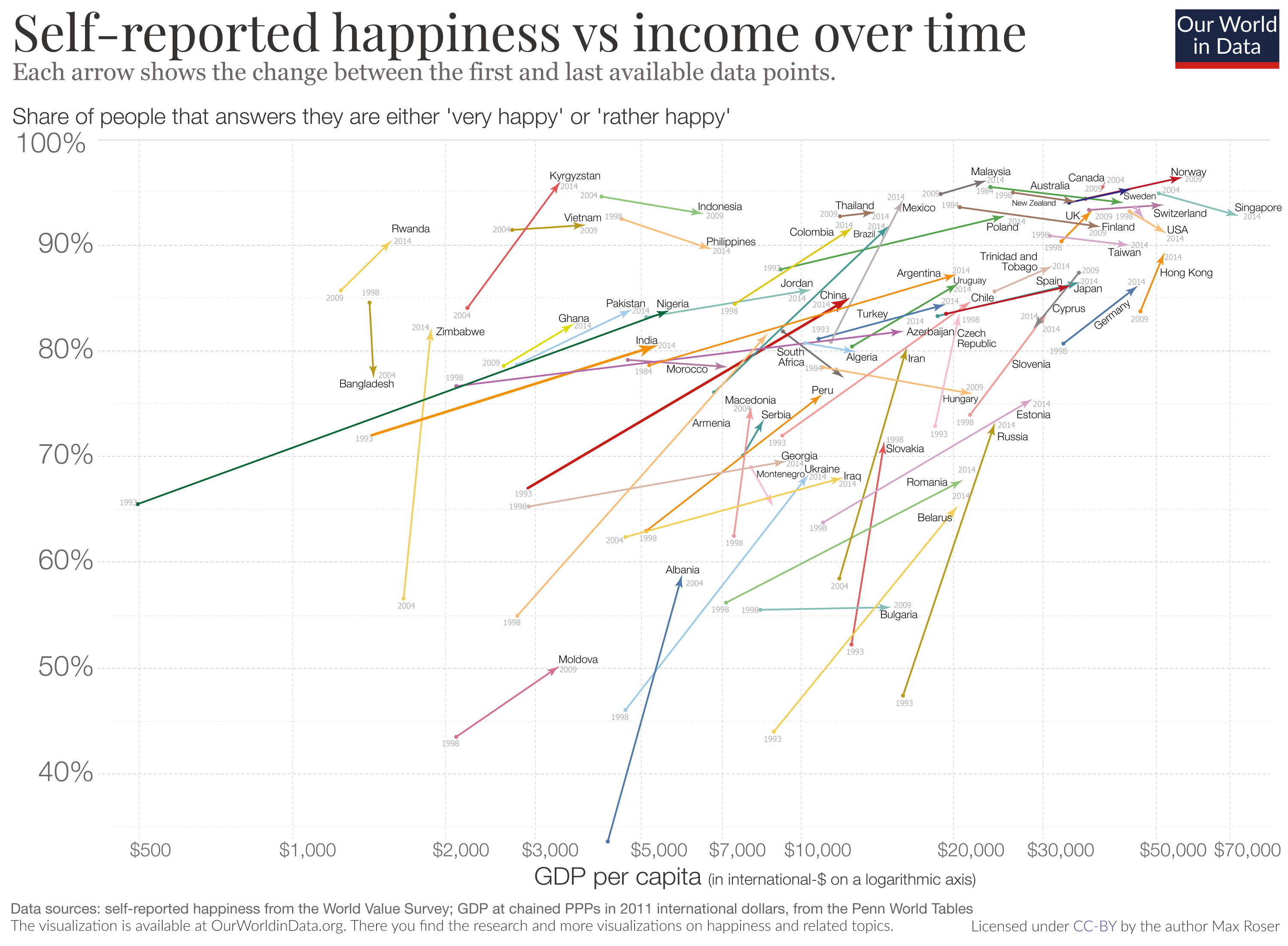 To show the income-happiness correlation across countries, the chart plots the relationship between self-reported life satisfaction on the vertical axis and GDP per capita on the horizontal axis. Each country is an arrow on the grid, and the location of the arrow tells us the corresponding combination of average income and average happiness.