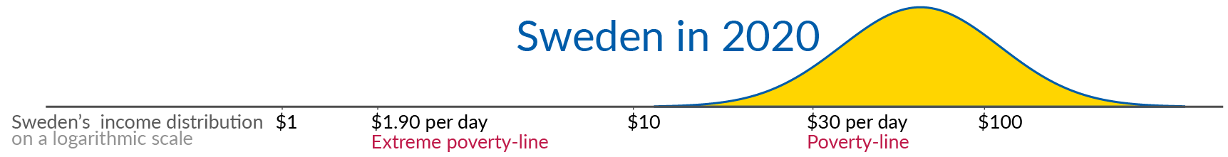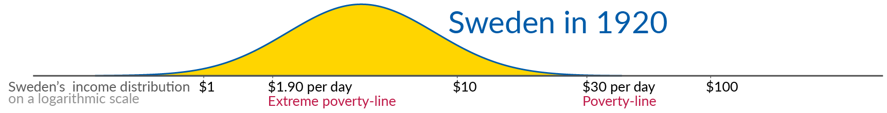 The global data makes clear why the world needs much more growth to end poverty. The world as a whole today is in a situation not so different from Sweden a century ago. The majority of the world left extreme poverty behind, but is still far poorer than $30 a day.