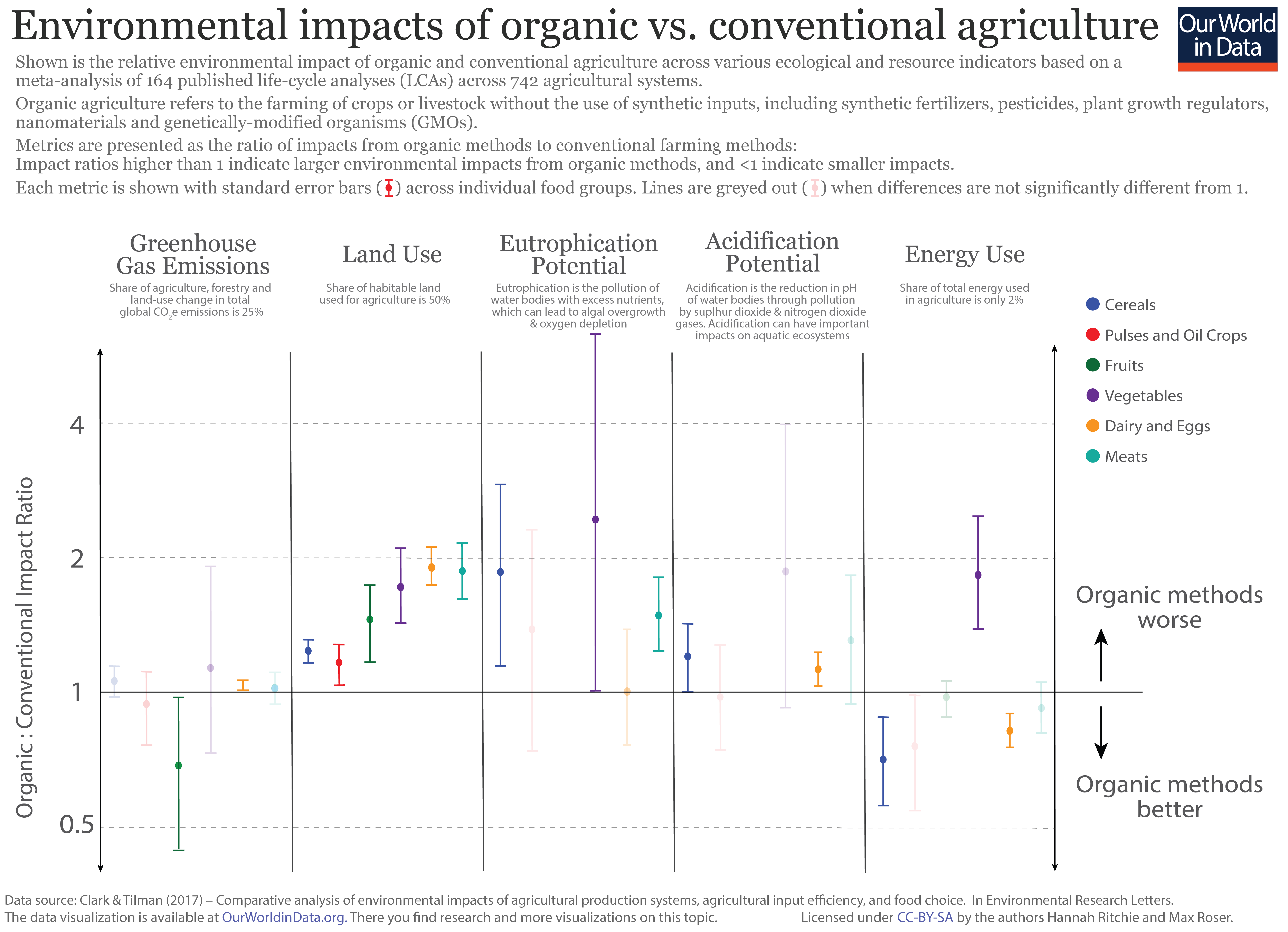 Another point to consider is that conventional agriculture is not necessarily better across all food types. Context, both in terms of the food commodity and the local environment, can be important. For example, if greenhouse gas reduction is our main focus, we might be best off eating organic pulses and fruits, and conventional cereals, vegetables, and animal products, based on the results presented above.