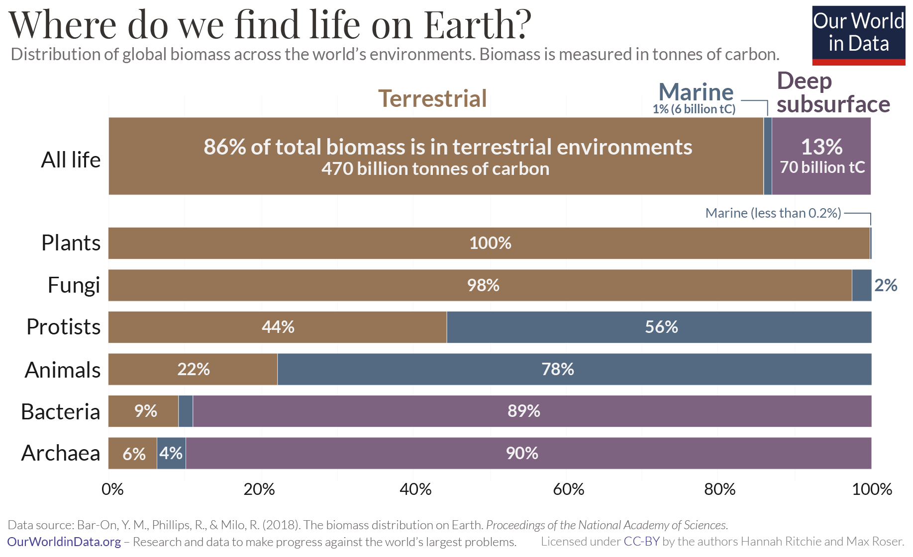 Hannah Ritchie (2019) - “Oceans, land, and deep subsurface: how is life distributed across environments?” Published online at OurWorldInData.org. Retrieved from: 'http://staging-site-fix-deleted-assets-in-cache/life-by-environment' [Online Resource]BibTeX citation