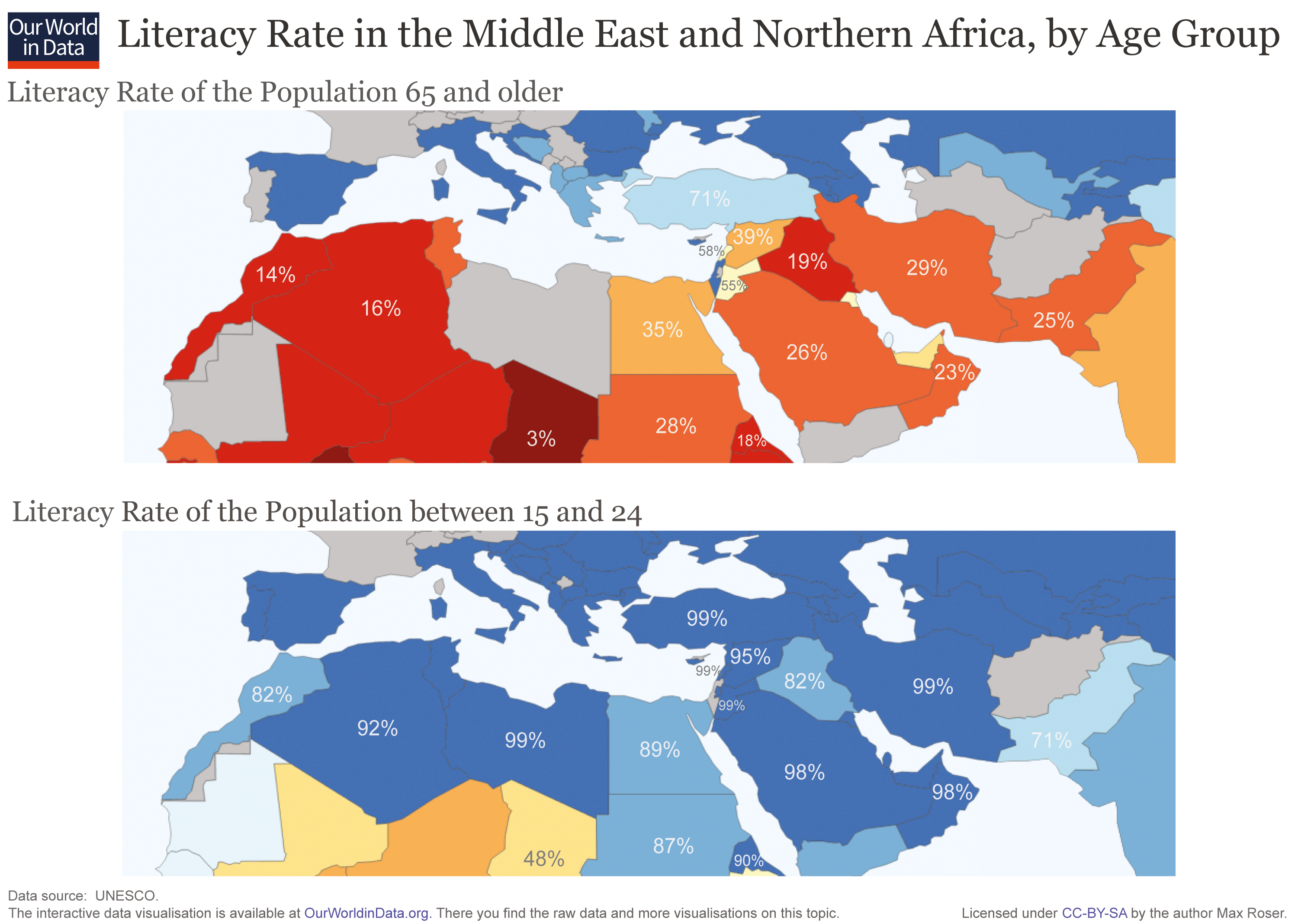 We highlighted above the fact that most low and middle-income countries feature large differences in literacy rates across generations. The visualization shows specifically how remarkably large these differences are in Northern Africa and the Middle East. Using UNESCO data, these maps show that in many countries in these regions, only less than a third of the older generation is literate – while in contrast, more than 90% of the younger generation is literate.