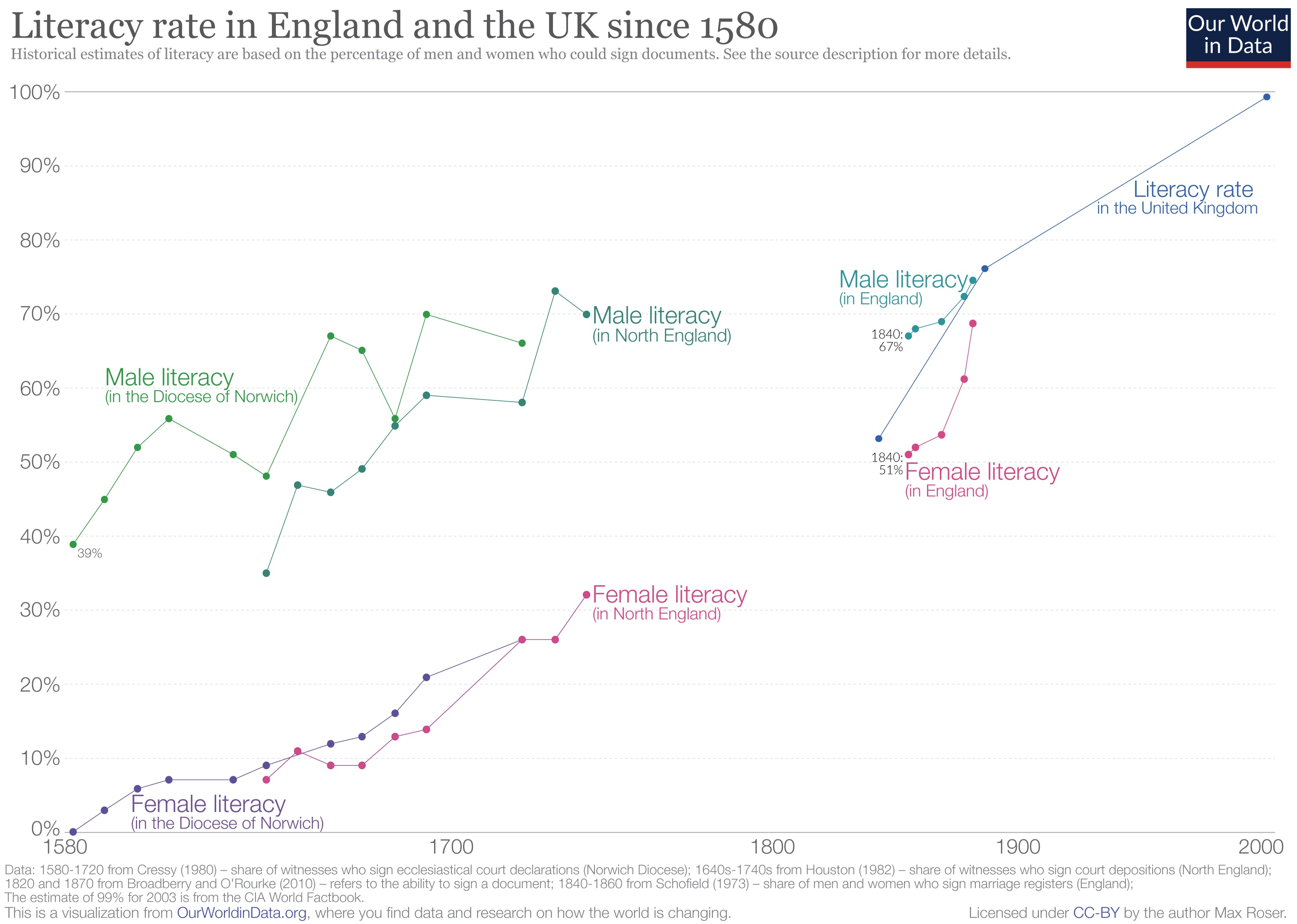 The historical estimates are based on the percentage of men and women who could sign documents, a very basic definition of literacy that is often used in historical research on education.3