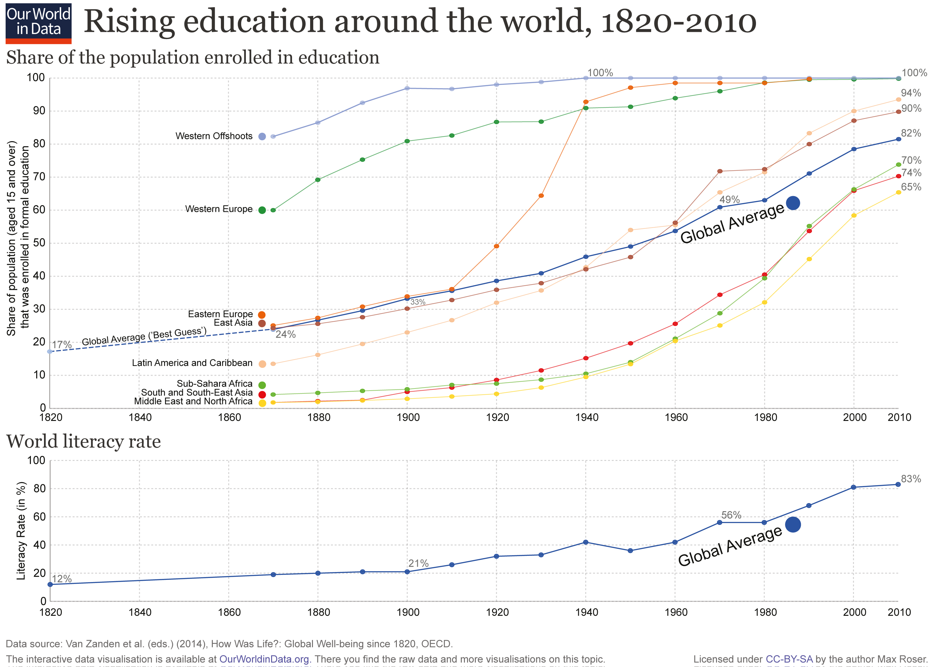 Today, in contrast, the global estimates of literacy and school attendance are above 80%, and the inequality between world regions – while still existing – is much lower.