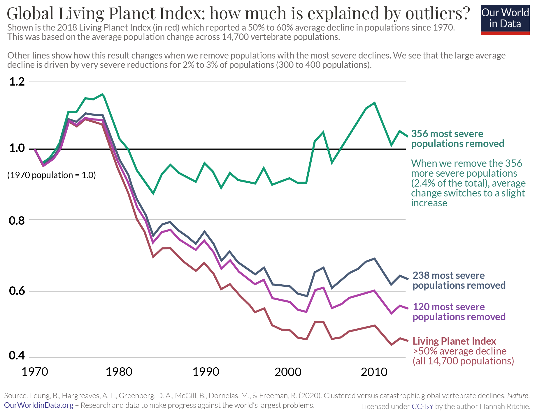 Hannah Ritchie (2022) - “Living Planet Index: what does an average decline of 69% really mean?” Published online at OurWorldInData.org. Retrieved from: 'http://staging-site-fix-deleted-assets-in-cache/living-planet-index-decline' [Online Resource]BibTeX citation