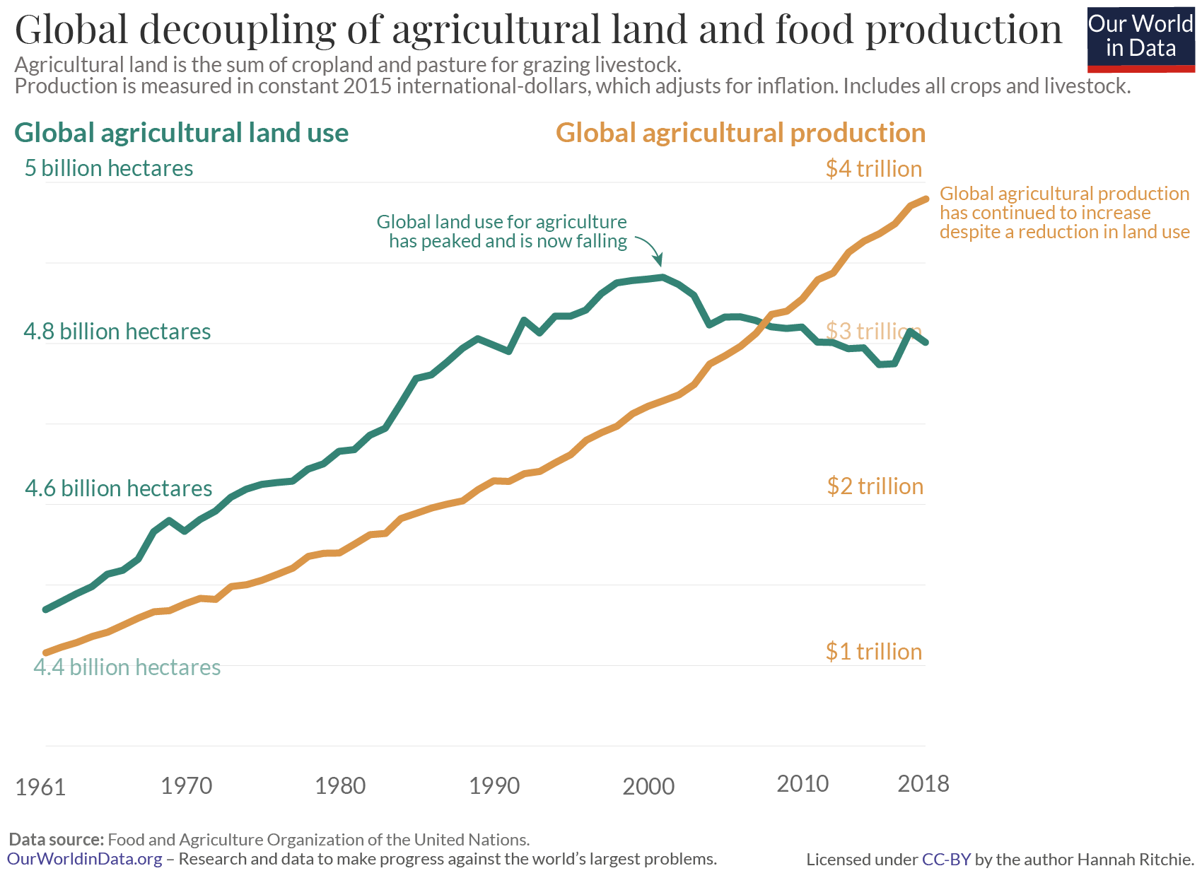 This shows that feeding more people does not have to mean taking habitat away from other wildlife. This decoupling means that we can produce more while giving land back to nature at the same time.