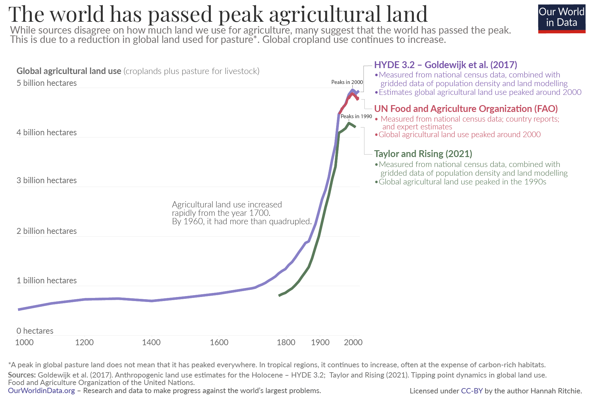 As you can see, they disagree on how much land is used for agriculture, and the time at which land use peaked. But they do agree that we have passed the peak.
