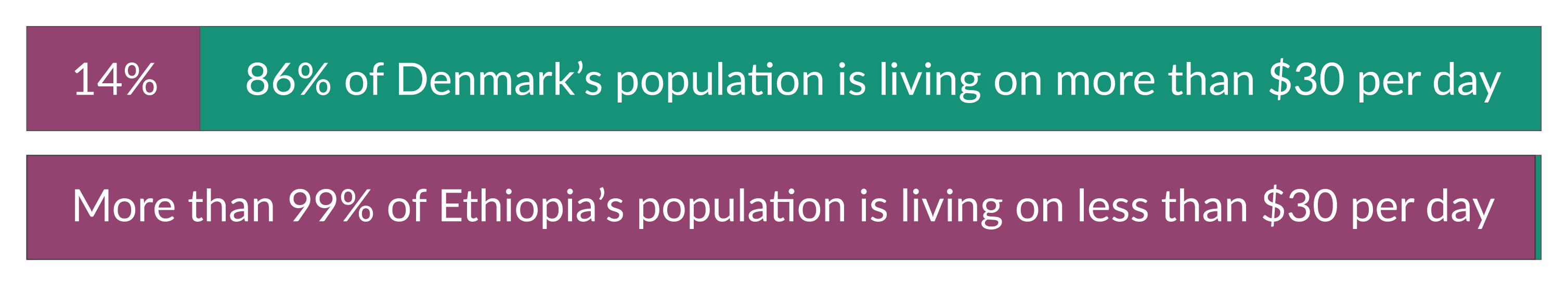 The comparison of a high-income country like Denmark and a much poorer country like Ethiopia makes clear just how important this aspect is. A person living in Denmark has a chance of 86% that they are not poor. A person who happens to be born into a country where the average income is low is almost certainly living in poverty. In Ethiopia more than 99% of the population lives on less than $30 per day. This is why a rise in the average level of income in a country – economic growth – is so crucial for reducing poverty.
