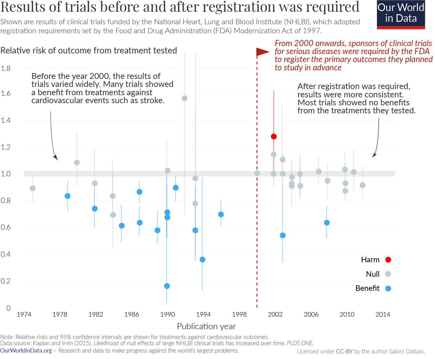 This requirement reduced the bias towards positive findings in published research. We see evidence of this in the chart, showing clinical trials funded by the National Heart, Lung and Blood Institute (NHLBI), which adopted this requirement.