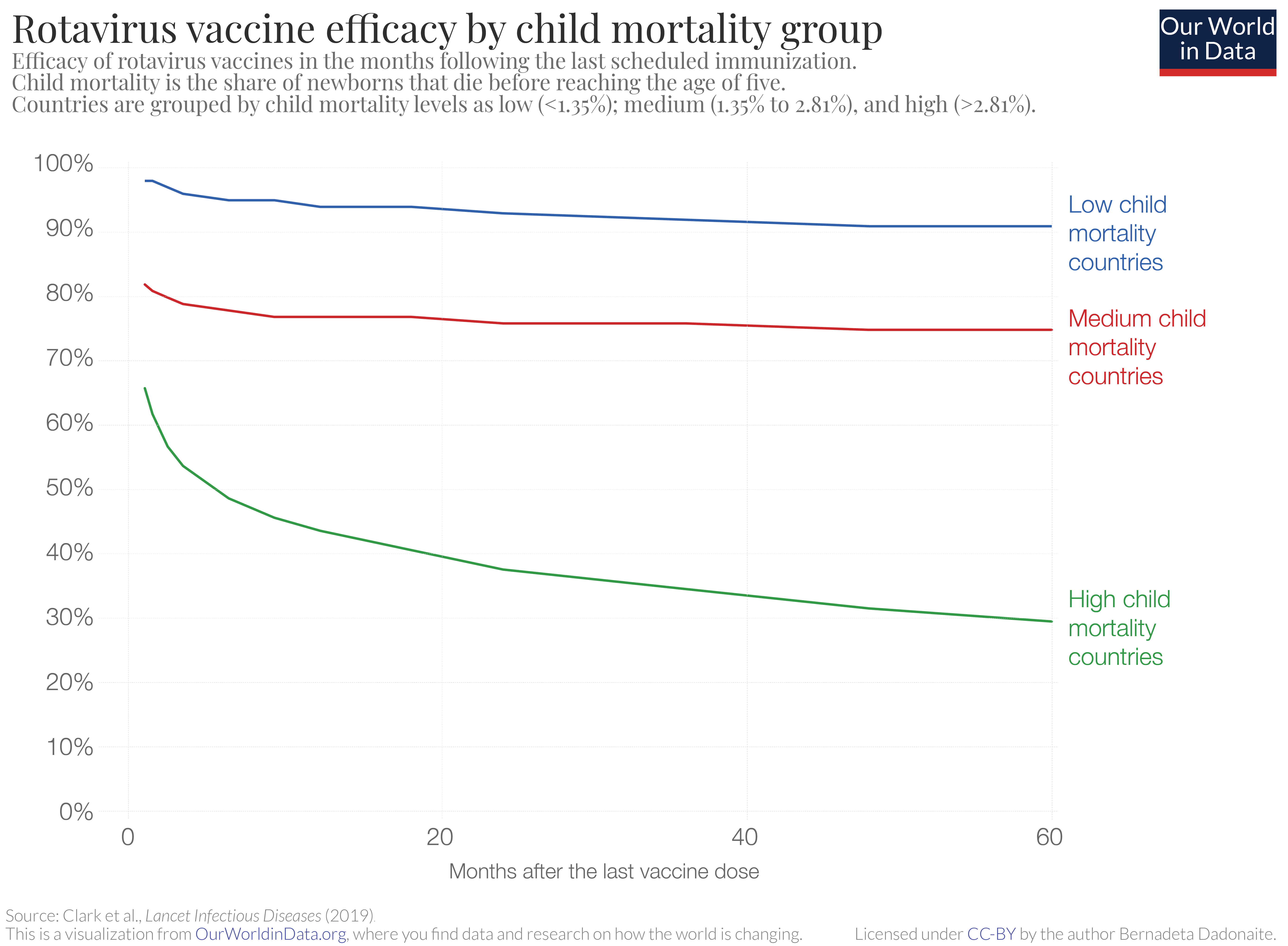 The chart is from a recent study by Clark et al., which looked at how the efficacy of live oral rotavirus vaccines changes in different countries following vaccination. The chart shows that in countries with high child mortality rates, not only is the immediate vaccine efficacy lower – 98% in low child mortality countries versus 66% in high child mortality countries – but also the vaccine efficacy decreases faster in high child mortality countries over time.11