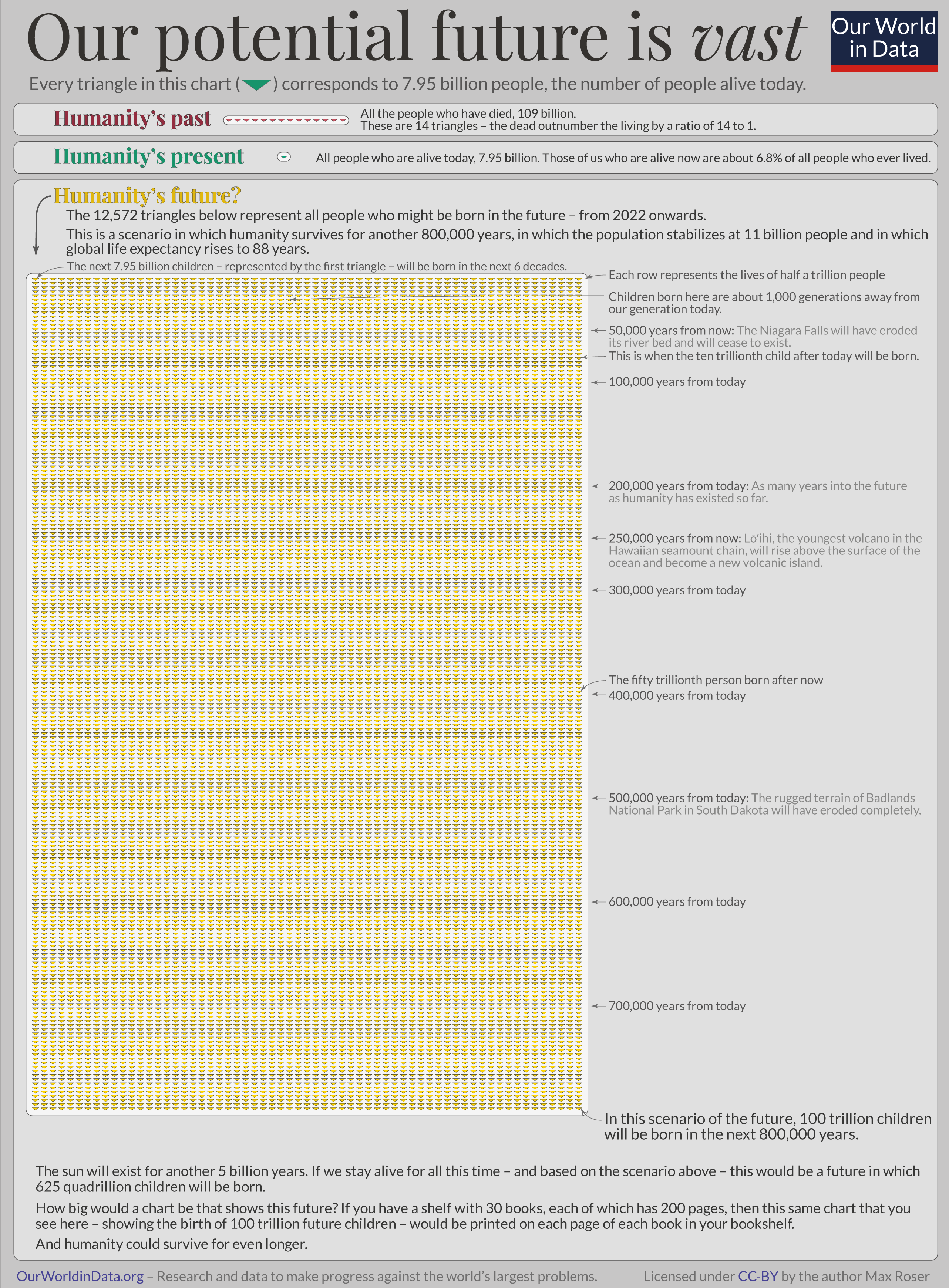 The chart visualizes this. Each triangle represents 7.95 billion people – it is the green triangle shape from the hourglass above and corresponds to the number of us alive today.