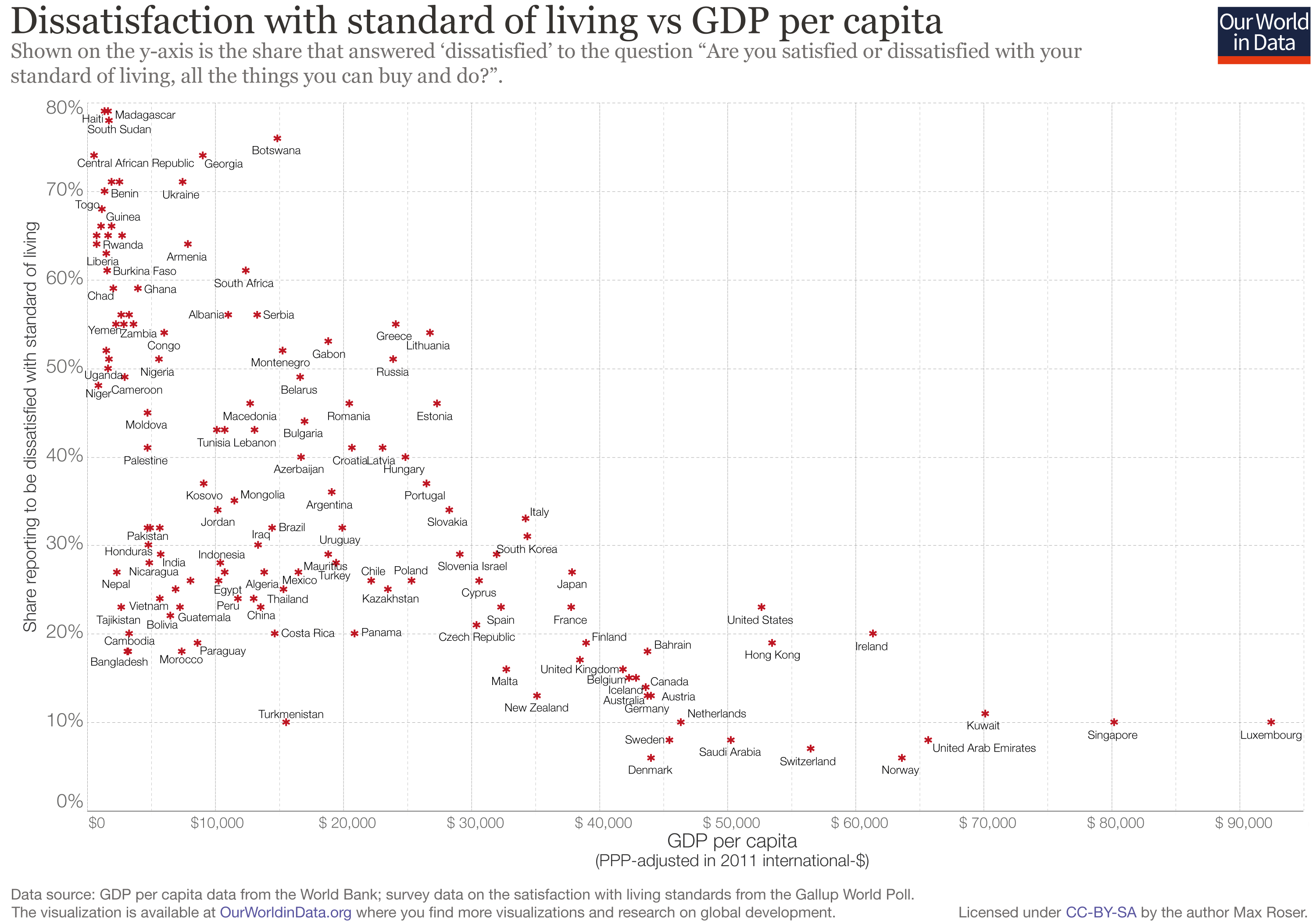 Dissatisfaction with standard of living vs GDP per capita1