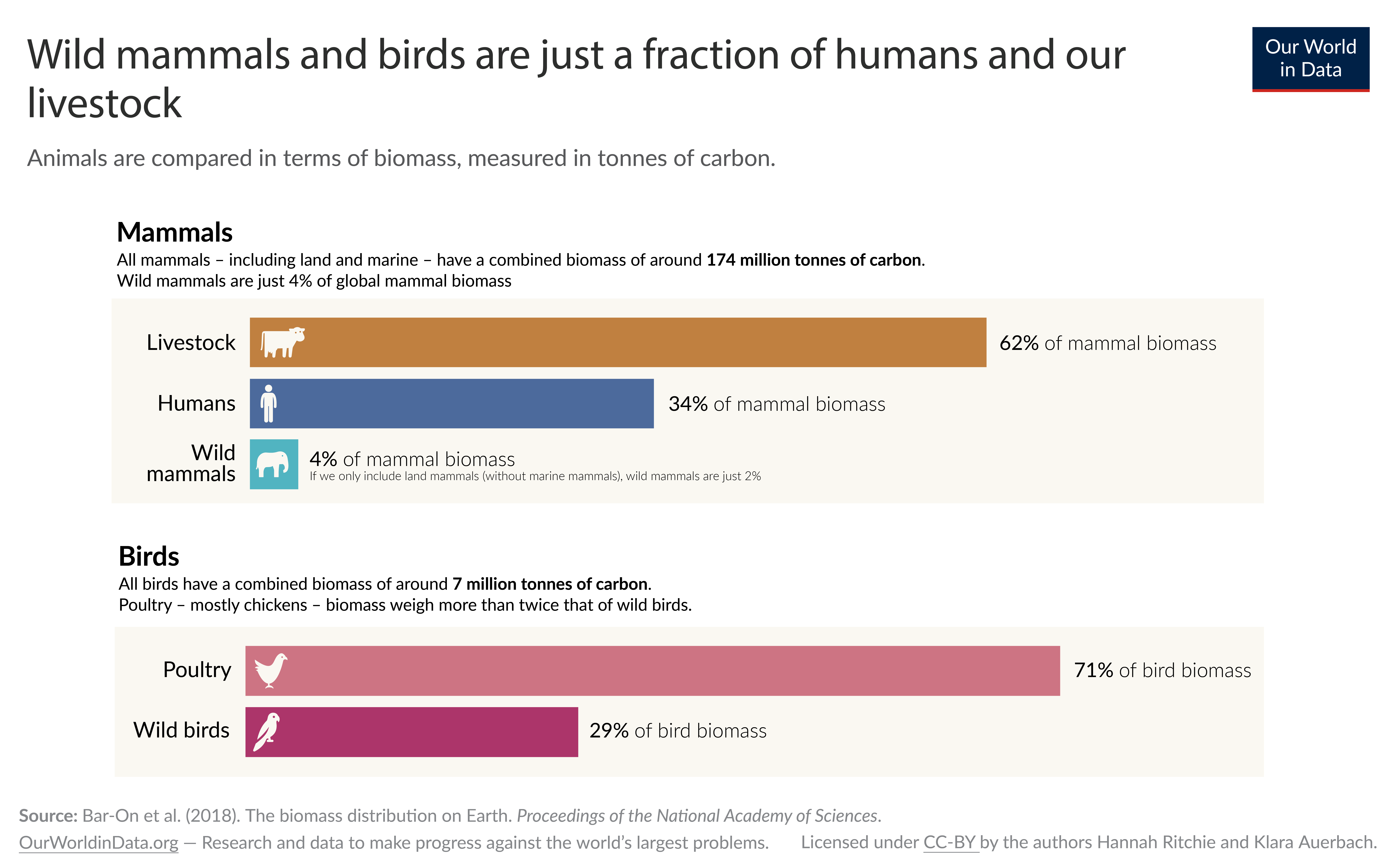 Livestock make up 62% of the world’s mammal biomass; humans account for 34%; and wild mammals are just 4%.