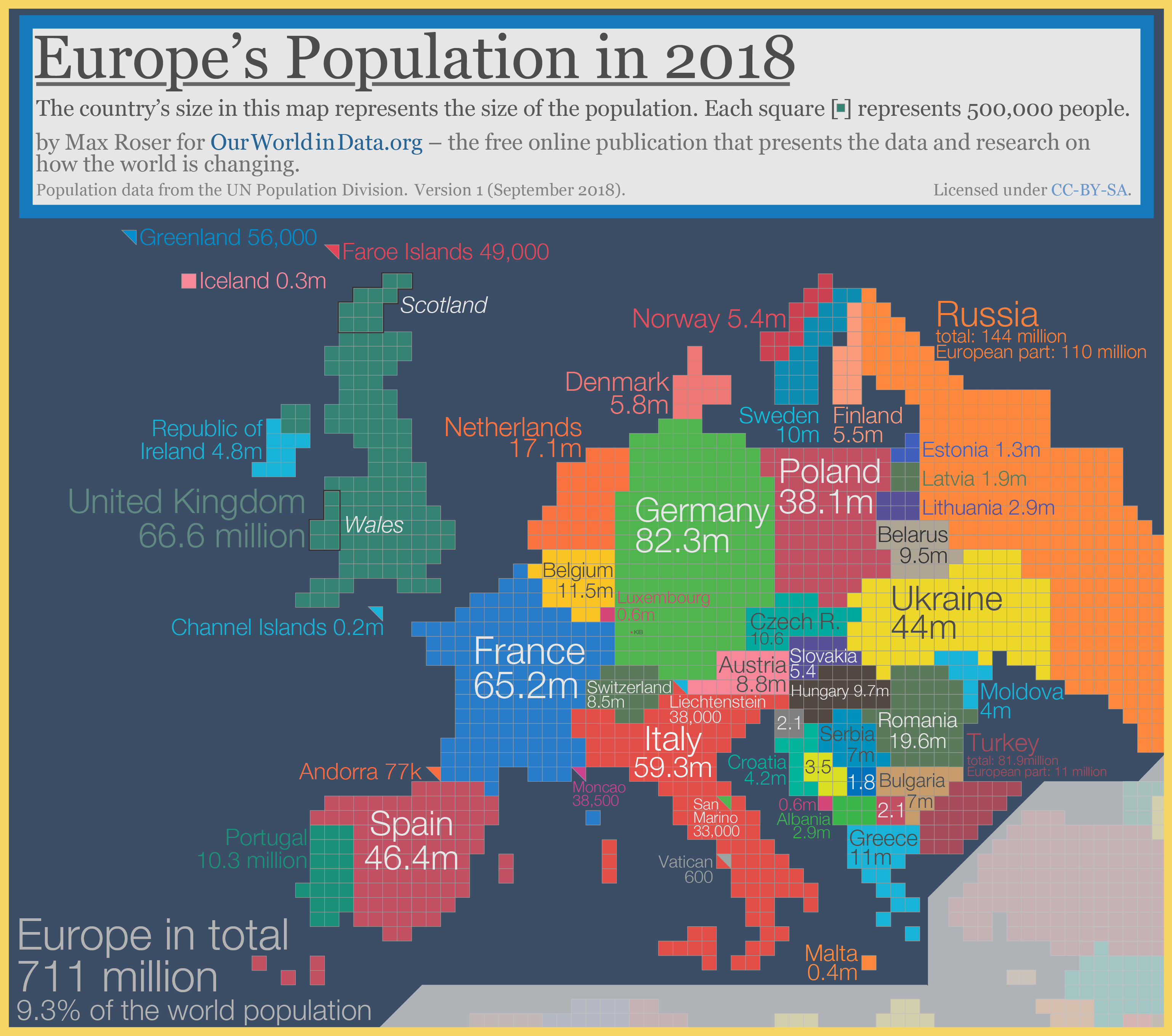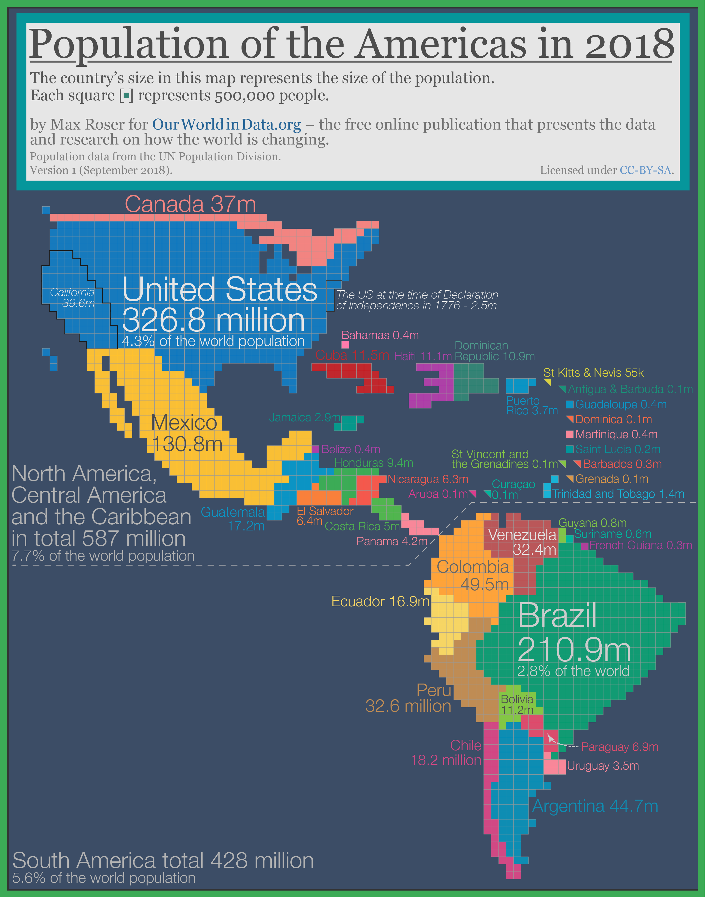 The cartogram is made up of squares, each of which represents half a million people of a country’s population. The 11.5 million Belgians are represented by 23 squares; the 49.5 million Colombians are represented by 99 squares; the 1.415 billion people in China are represented by 2830 squares; and this year’s entire world population of 7.633 billion people is represented by the total sum of 15,266 squares.
